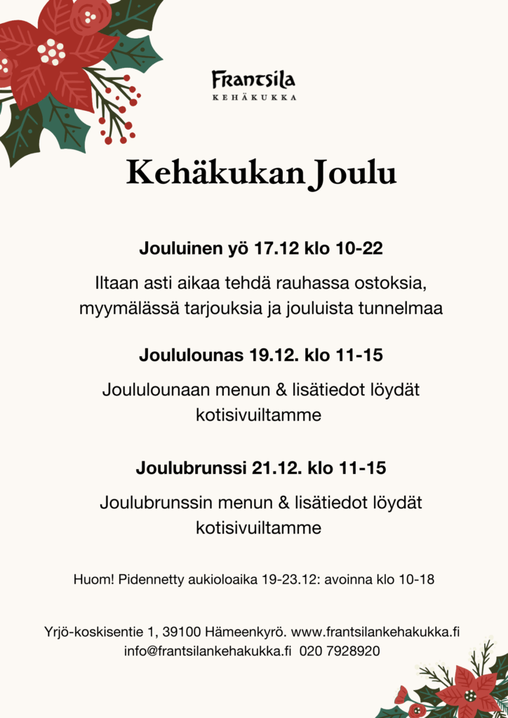 Hämeenkyrössä Pappilanjoen rannalla sijaitseva Frantsilan Kehäkukka on suosittu matkailukohde. Kauniissa, vuonna 1875 rakennetussa vanhassa koulurakennuksessa toimivat viehättävä kahvila, talonpoikaistyyliin sisustettu kasvisravintola sekä myymälä, josta voi ostaa luomutuotteita vuoden ympäri. Kahvilasta löydät kattavan valikoiman leivonnaisia, joista suurimman osan leivomme itse. Meillä on myös gluteenittomia, vegaanisia sekä keto- ja raakaleivonnaisia vaihtoehtoja. Kasvisravintolamme tarjoilee päivittäin herkullista kasvislounasta.