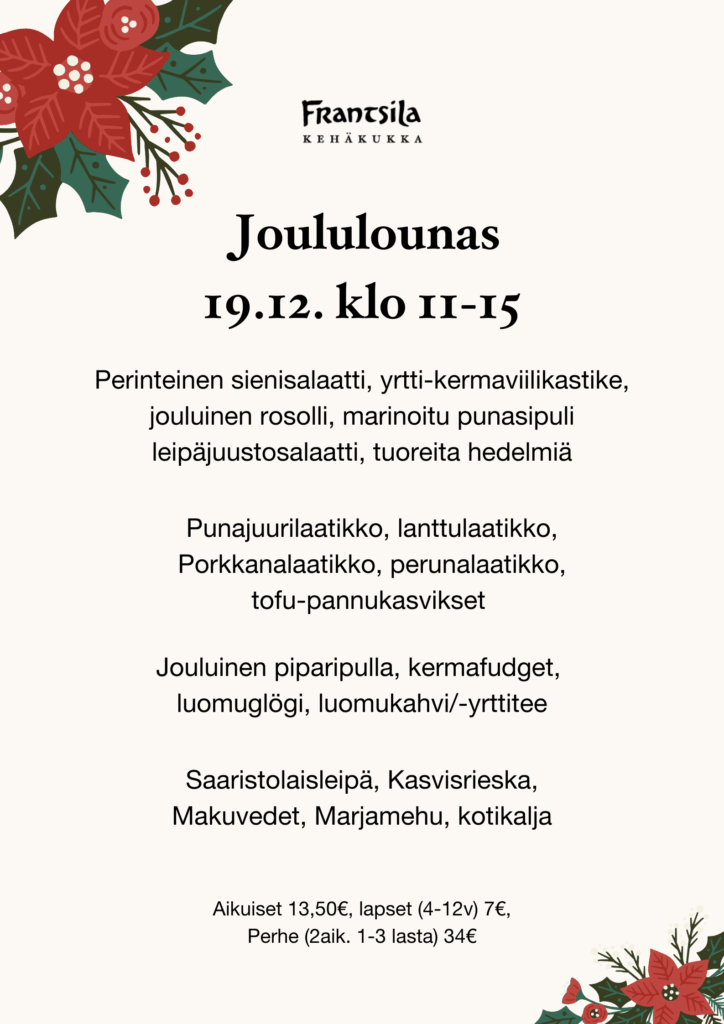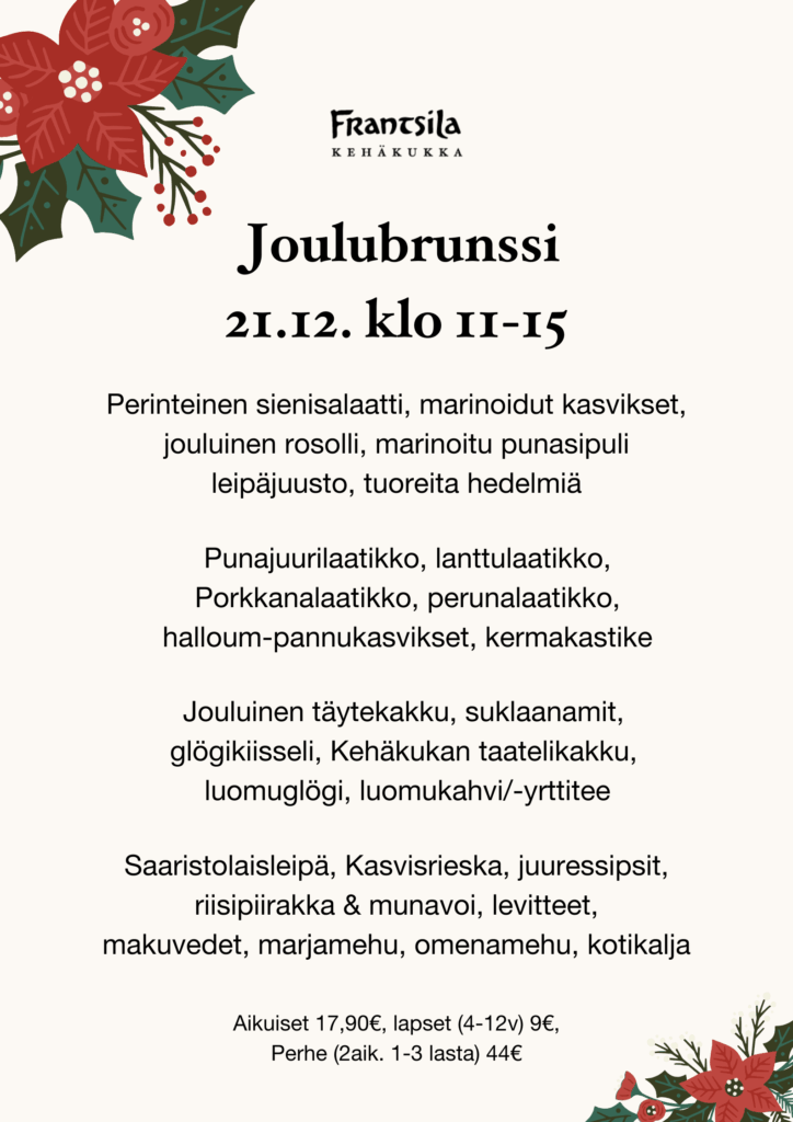Lounas ma-la klo 11-14, sunnuntaisin kasvisbrunssi klo 11-15